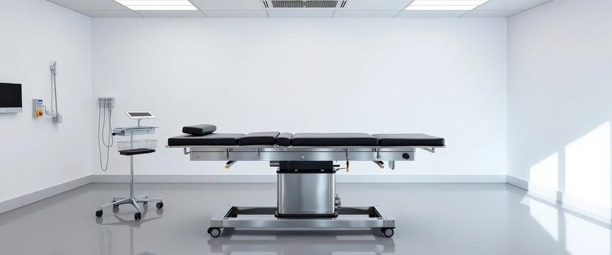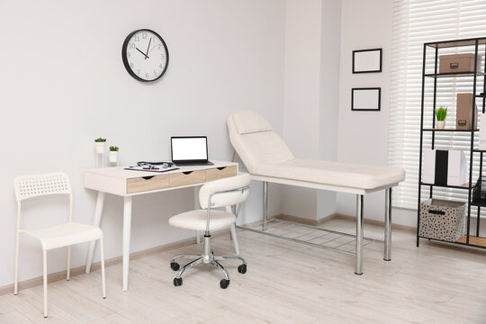 Clean and comfortable room in the hospital with examination table. Doctor's office. Doctor's room close up. Hospital check-ins.