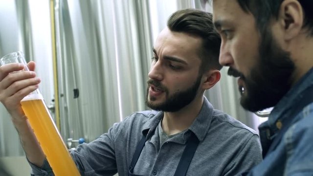 Tilt up of two brewery workers examining freshly made beer in measuring glass tube and discussing quality of beverage