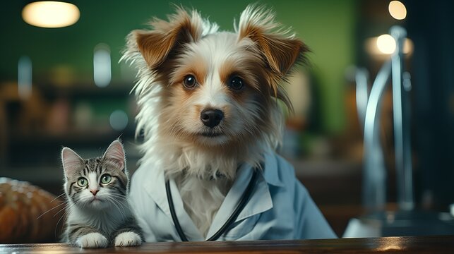 Vet examining dog and cat. Puppy and kitten at veterinarian doctor. Animal clinic. Pet check up and vaccination. Health care.