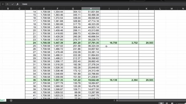 Footage of an dark mode excel sheet scrolled on computer screen showing bank loan amortization table, data changing. Banking