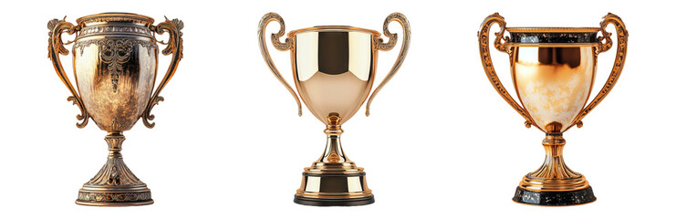 Three golden, silver and bronze trophies placed on different stands