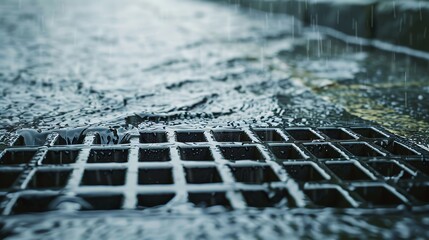 Storm drain on a city street, heavy rainwater flowing rapidly, detailed pavement, urban setting, dramatic and realistic