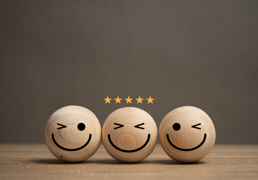 concept of service satisfaction A smiley face ball is placed on the table and there is a gold star on the ball. The customer feedback survey rating. Business excellent score. Good evaluation emotion.