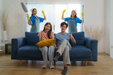 Satisfied Asian homeowner gives a thumbs-up, expressing delight and approval for the exceptional cleaning service provided by the diligent Asian maid