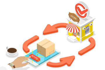 Concept of return policy and send package back to get money refund. Shopping purchase compensation after customer guarantee terms. Bad delivery and return policy service.