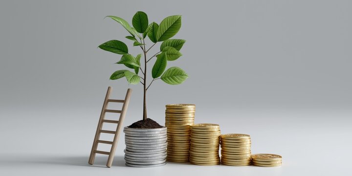 A plant is growing out of a silver pot with a ladder next to it. There are stacks of gold coins on the ground. Concept of growth and wealth