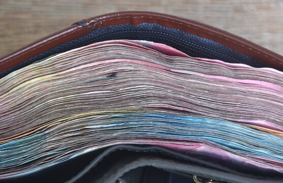 indonesia rupiah banknote in brown wallet on wooden table texture and background