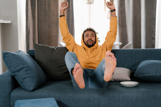Attractive excited dark skinned guy cheers for favorite football team in mobile phone watching over sports betting at home African american man watch tv sport game celebrate goal team victory on sofa