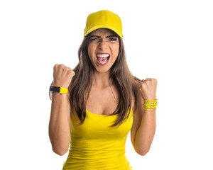 Brazilian woman fan celebrating on soccer match on white background.