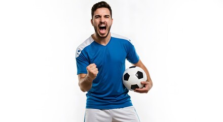 excited soccer player with ball and clenched hand Isolated On White