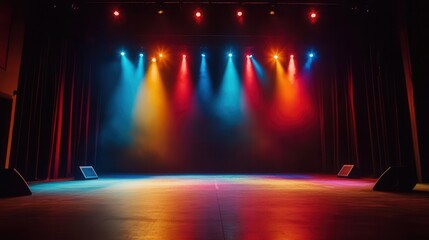 Vibrant stage illuminated by colored spotlights and smoke, capturing the excitement and anticipation of live performances, Generative AI