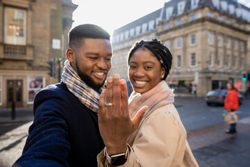 Joyful couple celebrating engagement with heart symbol outdoors