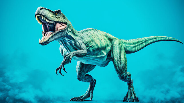 Green dinosaur roaring against a blue and white background, a prehistoric predator,  evoking fear and excitement for a Jurassic adventure.