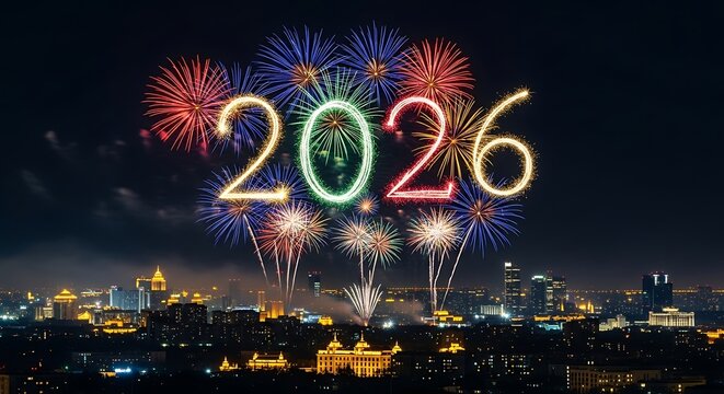 A vibrant cityscape illuminated by a dazzling fireworks display spelling out 2026 in the night sky, symbolizing celebration, anticipation, and the promise of a new year filled with hope and excitement