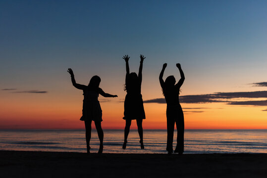 Silhouette of three girlfriends jumping on the beach at sunset