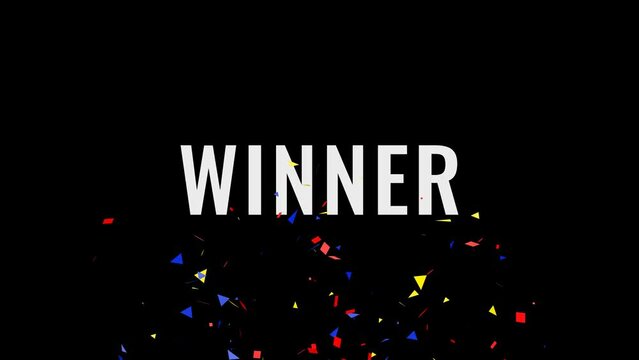 Winner celebration text animation with colorful confetti explosion motion graphic elements on black screen background