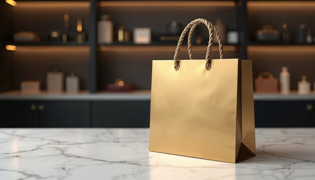 Gold shopping bag rests on marble counter. Luxury retail branding mockup, elegant product presentation. Store interior background with shelves. Premium purchase or gift.