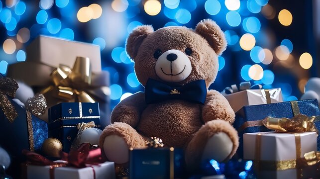 Teddy bear surrounded by designer gifts and luxury branding on blue lights background