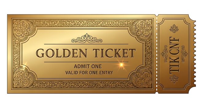 Luxurious golden ticket with ornate border and perforated stub for special event entry or prize