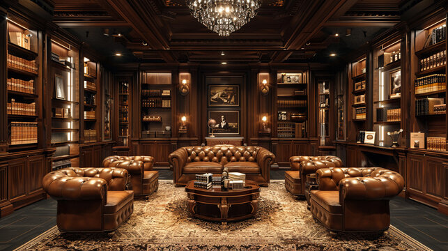 Sophisticated cigar lounge with rich leather chairs and wood accents8K