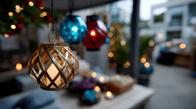 A beautifully arranged outdoor seating area featuring colorful lanterns, creating a warm ambiance with soft lighting, perfect for gatherings and celebrations.