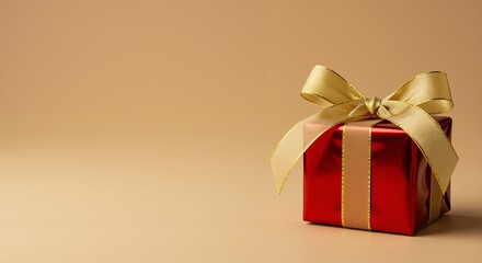 Luxury gold gift box adorned with satin ribbon on shimmering background ideal for festive celebrations and elegant occasions with text space