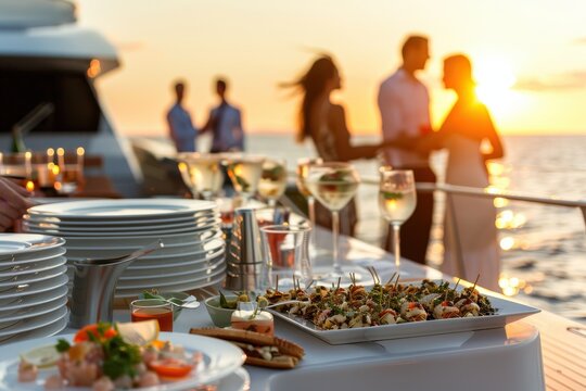 A picturesque outdoor dinner party with guests mingling around a table adorned with candles and elegant decor