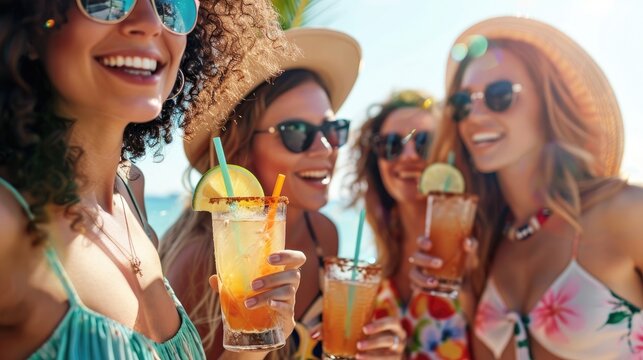 Group of friends drinking cocktails at party on luxury resort. Summer vacation concept.