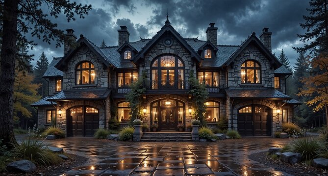 Luxurious Modern Mansion with Infinity Pool and Fire Pit at Dusk, Architecturally Stunning Home Exterior