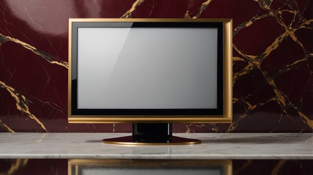 Luxury flat screen television with gold frame on marble table against elegant maroon and gold veined marble wall