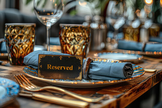 An elegant 'Reserved' sign on a table in a sophisticated restaurant with a chic table setting. An elegant 'Reserved' sign stands out against a beautifully arranged table, embodying sophistication.