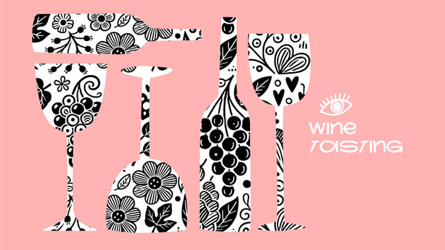 Elegant black-and-white wine banner with intricate patterns on glasses and bottles, perfect for tasting event posters, winery promotions, and creative menus.