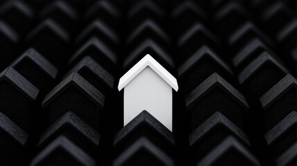A white 3D house surrounded by homogeneous black 3D houses symbolizing uniqueness and difference. The concept of individuality in a homogeneous environment, emphasizing difference and exclusivity.