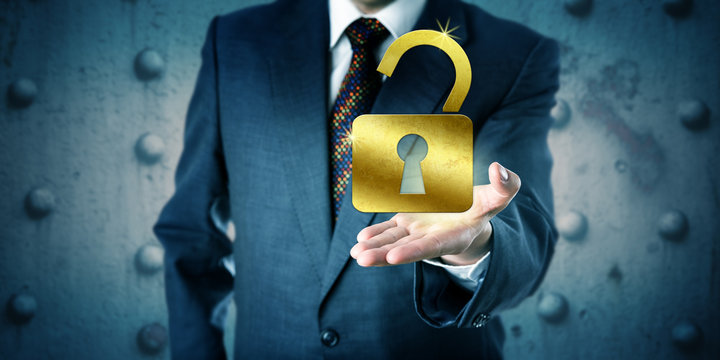Business Manager Offering A Golden Open Padlock