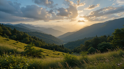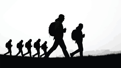 Pair of excursionist walking on mountainous trail. Summer Trekking
