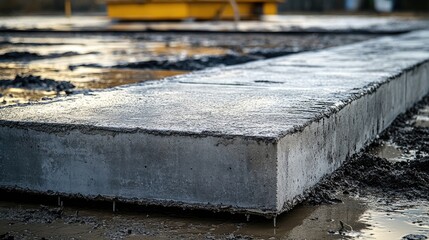 Freshly poured concrete sidewalk, close-up showing fine details and texture, with city construction equipment around