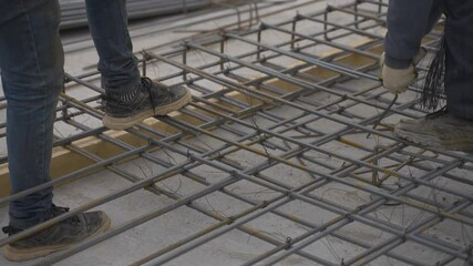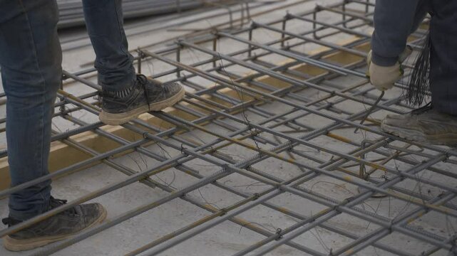 Close focus on sturdy rebar framework, intricate intersections and rugged texture over concrete foundation, subtle lighting--style raw