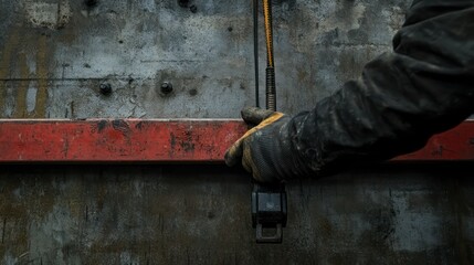 A construction worker's hand operates a hydraulic jack, carefully lifting a heavy beam into position on-site.