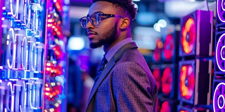 Fashionable modern black executive standing among graphics cards and high-end technology components glowing