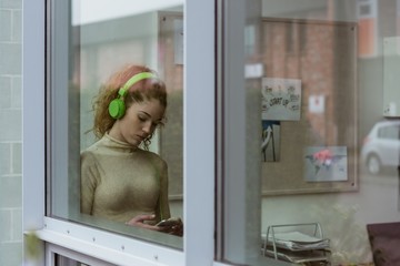 African american businesswoman in headphone using smartphone to listening music after work finished