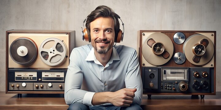 Smart business man listening and enjoy music while wear headphone. Profession project manager smiling while getting good news, getting promotion, increasing sales. Relaxing man enjoy music. Exultant.