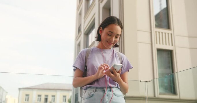 Asian woman in earphones enjoys listening to music in street