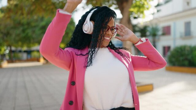Carefree African American businessman dancing typing laptop in office listening music enjoying audio male mature business man 40s executive celebrating good work winning online dance using computer