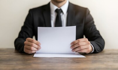 Businessman holding a blank paper, seated at a wooden table, in a suited outfit, with a minimalistic background.
