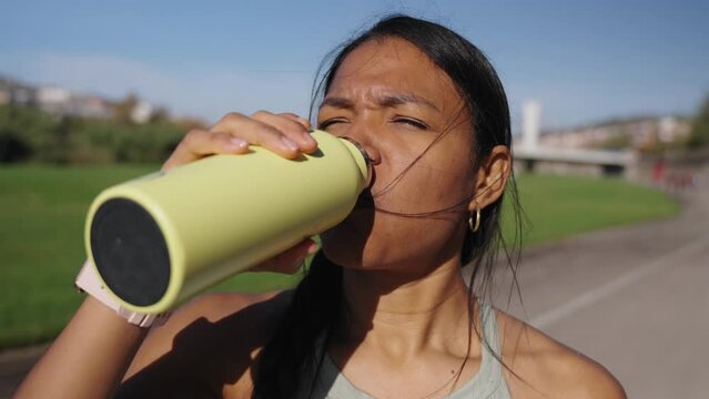 Close up video of an exhausted African american sport woman taking a break after running to drink water. Female hydrating using an ecological and environmental friendly bottle after training outdoors.