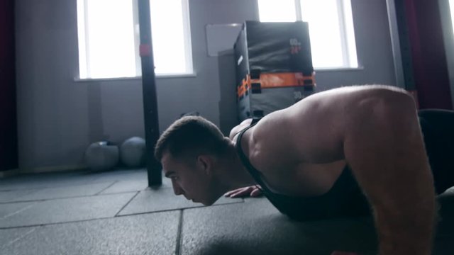 Sportsman exercising in the gym. Muscular young man doing pushups on exercise mat.