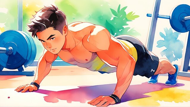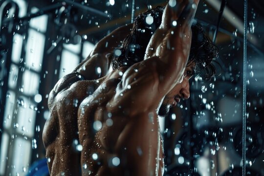 A muscular man in athletic attire, his brow furrowed in concentration, engaged in a vigorous exercise session against a stark grey wall, his body a testament to dedication and strength.