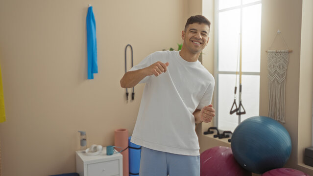 Young man smiling in gym environment with exercise equipment and bright interior showcasing active lifestyle and fitness motivation.