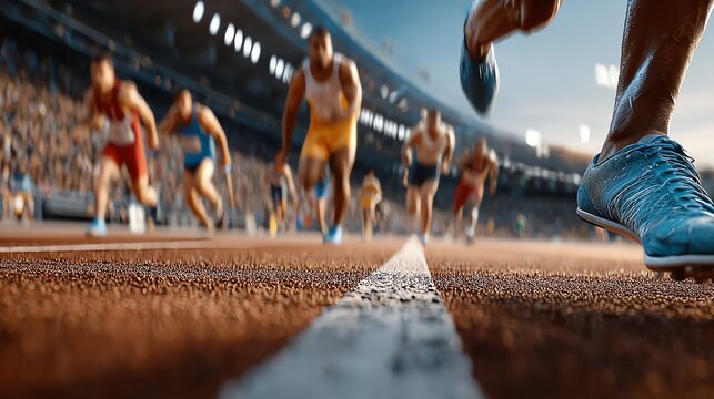 Athletes Running Race on Track in Stadium with Crowd Excitement