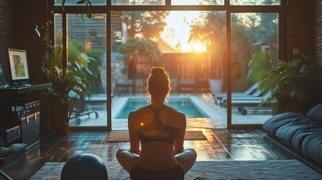 A documentary-style image of a person participating in a virtual fitness class on a laptop, with real exercise equipment in the foreground. The minimalist composition captures the blending of virtual